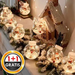 Az átlátszó gömbök aranyos figurákat, műhavat, tobozokat és LED-lámpákat tartalmaznak.