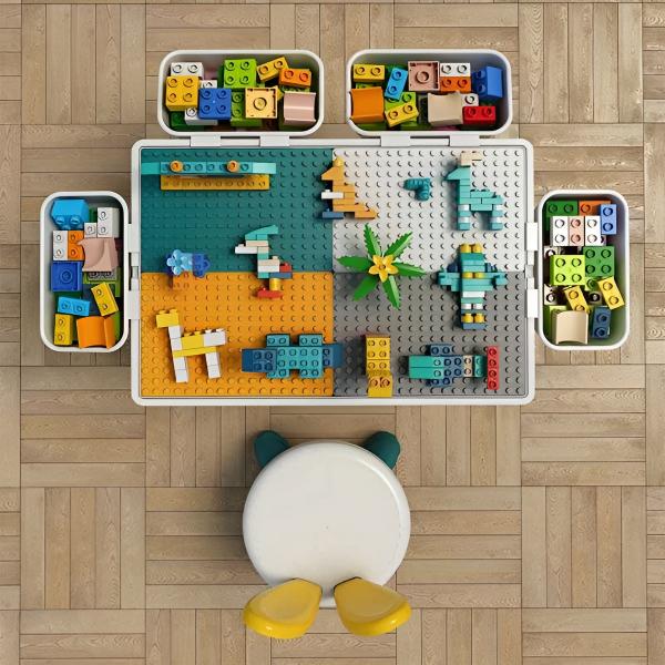 Az asztal mindkét oldalán használható, az egyik oldala a blokkok összeszereléséhez készült, a másik pedig sík felület.